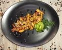 Баклажаны, помидор, сыр твороженный, соус Чили кисло-сладкий, кунжут, зелень