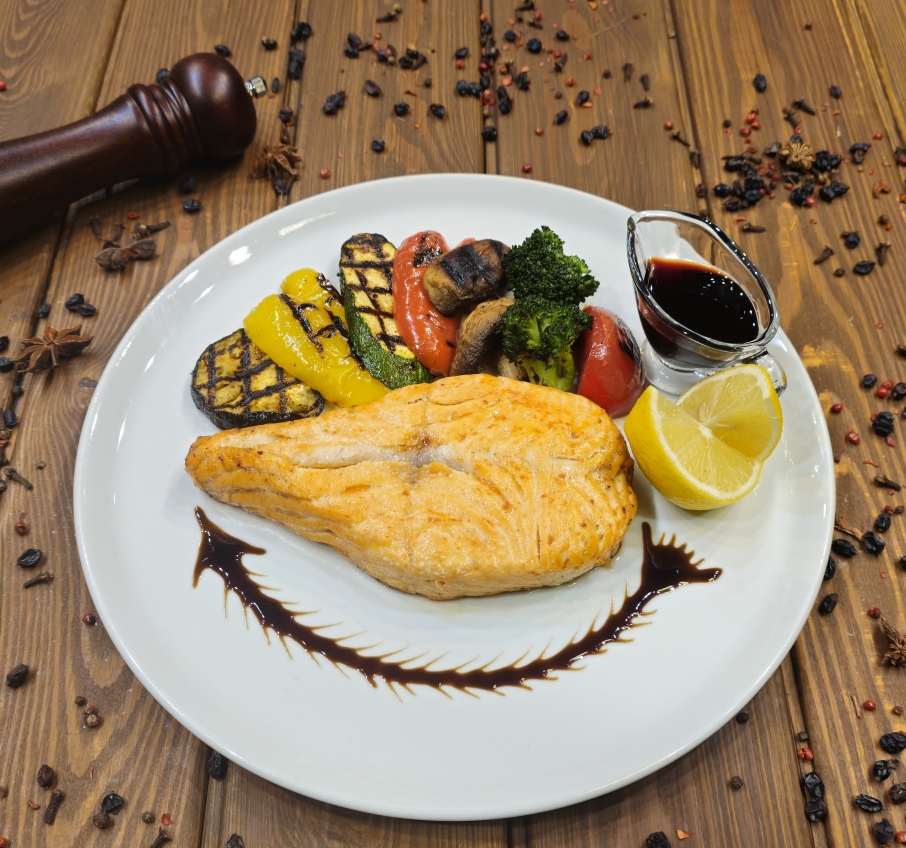 Микс салатов, семга с/с, кедровые орехи, крем бальзамический, лимонный сок, соевый соус, оливковое масло.