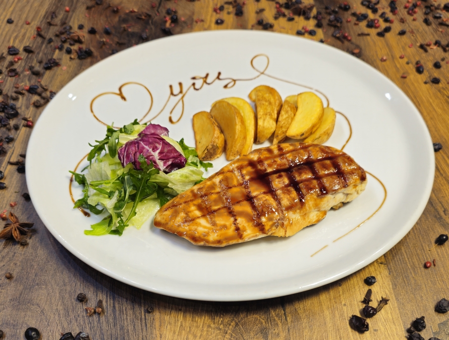 Филе куриное, салат айсберг, сыр пармезан, соус Цезарь, гренки